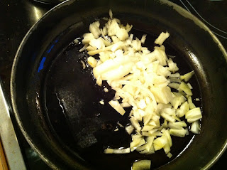 Onions sautee-ing in pan with tablespoon of olive oil.